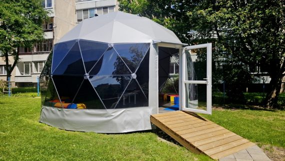 Dome of 8 meters in diameter, 70% covered by white colored canvas, and the rest transparent canvas.