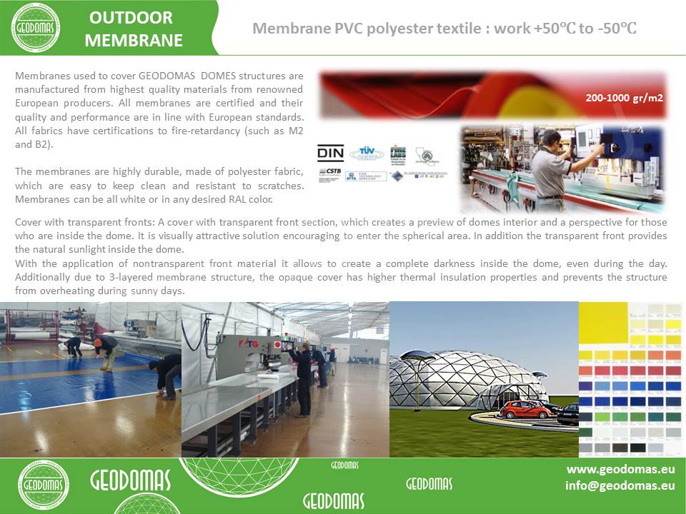 Naudojamos PVC dangos yra ilgaamžės, lengvai prižiūrimos ir atsparios aplinkos veiksniams. Geodomas projektas ne tik tvarus, bet ir lengvai transformuojamas – galima keisti vidaus išplanavimą pagal sezoniškumą ar poreikius.