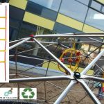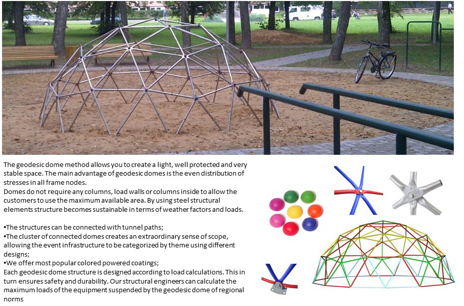 Metalinė, cinkuota sferinės formos konstrukcija | Kupolo formos paviljono rėmas pagamintas iš cinkuoto plieno, vieno varžto jungtys, apatinės jungtys kupolo tvirtinimui.