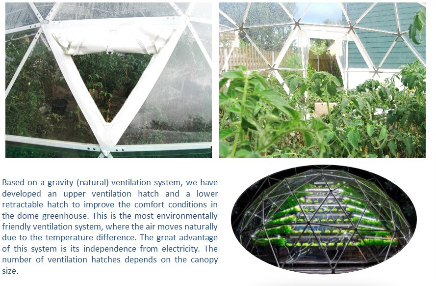 The geodesic dome structure allows you to create a light, well protected and very stable space. The main advantage of geodesic domes is the even distribution of stresses in all frame nodes.