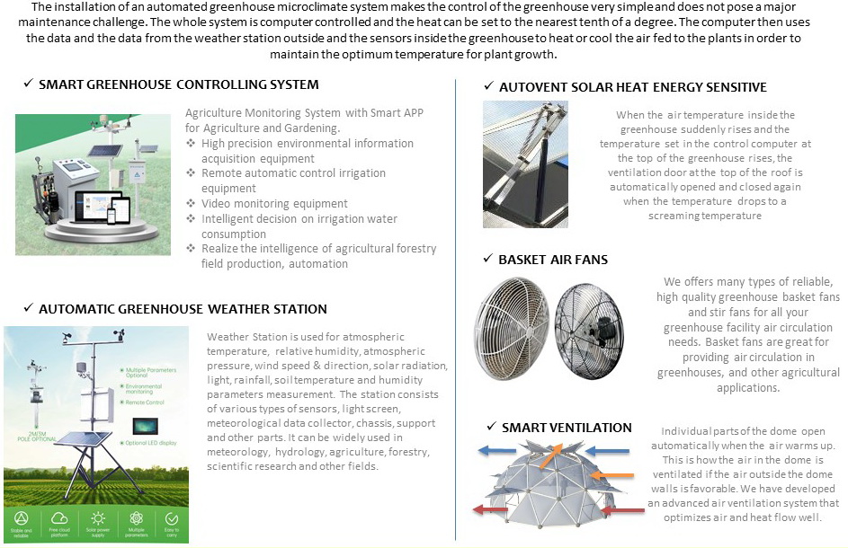 The installation of an automated greenhouse microclimate system makes the control of the greenhouse very simple and does not pose a major maintenance challenge. The whole system is computer controlled and the heat can be set to the nearest tenth of a degree. The computer then uses the data and the data from the weather station outside and the sensors inside the greenhouse to heat or cool the air fed to the plants in order to maintain the optimum temperature for plant growth.