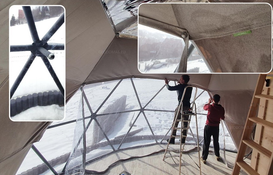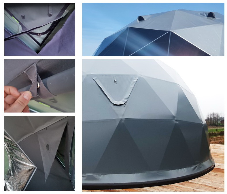 Dome covers we use the highest quality PVC tent fabrics. All our fabrics are certified and meet European Quality and Fire Resistance Standards. Detachable dome coating is known for its strengths and long service life. Due to the frequent weaving, the material is resistant to punctures, scratches and cuts. It is very easy to keep the dome covers clean. GEODOMAS durable covers are available in a variety of colors, resistant to mold and mildew, protected from UV rays and fire resistant. All fabrics have certifications to fire-retardancy NFP 92507: M2 ; DIN 4102: B1; EN 13501-1: B-s2-d0, BS 7837.