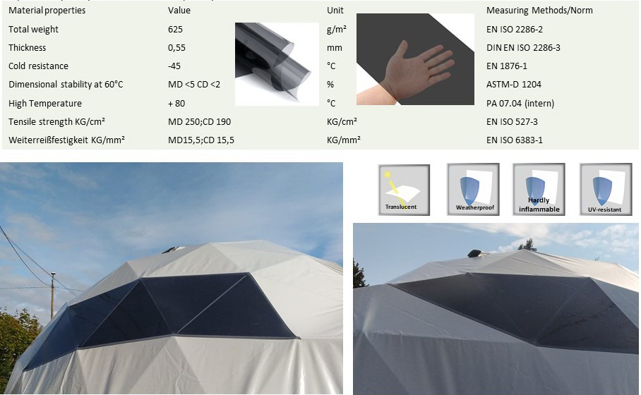 Dome covers we use the highest quality PVC tent fabrics. All our fabrics are certified and meet European Quality and Fire Resistance Standards. Detachable dome coating is known for its strengths and long service life. Due to the frequent weaving, the material is resistant to punctures, scratches and cuts. It is very easy to keep the dome covers clean. GEODOMAS durable covers are available in a variety of colors, resistant to mold and mildew, protected from UV rays and fire resistant. All fabrics have certifications to fire-retardancy NFP 92507: M2 ; DIN 4102: B1; EN 13501-1: B-s2-d0, BS 7837.