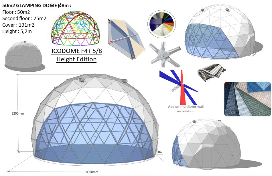 Glamping Domes do not require any columns, load walls or columns inside to allow the customers to use the maximum available area. By using steel structural elements structure becomes sustainable in terms of weather factors, livetime and loads.- The structures can be connected with tunnel paths;